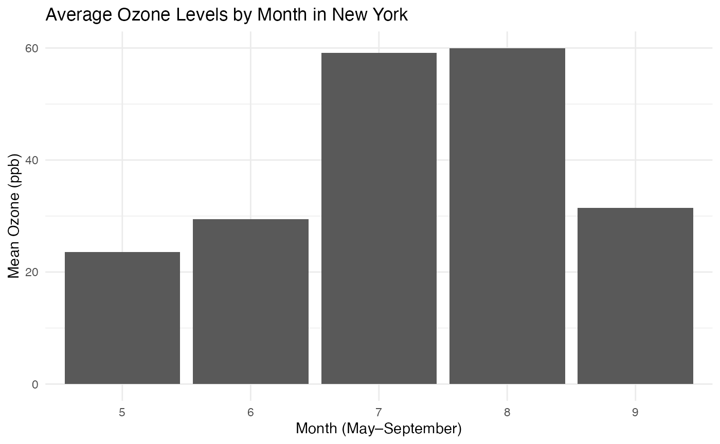 # ## Alt-text: A bar chart shows the average ozone concentration for each of the warmer months, with months on the x-axis and mean ozone concentration on the y-axis (exact scale unspecified). Bars increase in height from late spring, peak during midsummer, and then decrease toward the end of the season. This pattern indicates that ozone pollution intensifies in hotter months and diminishes as temperatures fall, reflecting the influence of sunlight and temperature on ozone formation.