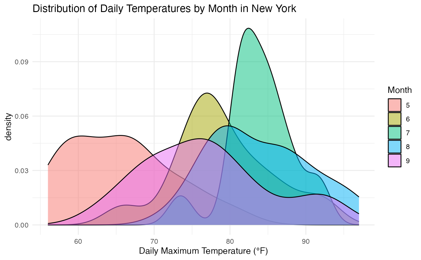 # ## Alt-text: A density plot displays overlapping curves representing the distributions of daily maximum temperatures for each month, with temperature on the x-axis (exact range not specified) and density on the y-axis. Curves for early-season months peak at lower temperatures and have narrower spreads, midsummer curves shift toward higher temperatures and show broader distributions, and late summer curves begin to move back toward cooler temperatures. This pattern indicates a clear seasonal trend, with the warmest and most variable temperatures occurring during midsummer.