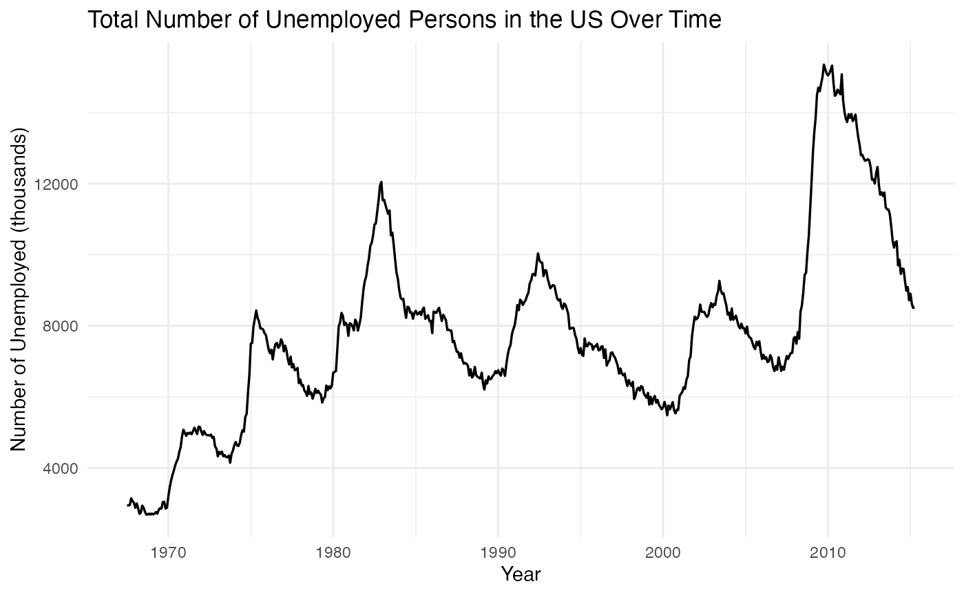 # ## Alt-text: A single time-series line graph shows the number of unemployed persons in the United States by month over several decades. The horizontal axis displays time in months and years, running from the mid-20th century to the early 21st century (approximate range, as exact years are not specified), while the vertical axis shows the count of unemployed people, increasing from low to high values (exact numerical scale is not visible). A single line, likely drawn in a solid colour, tracks unemployment over time. The line exhibits clear cyclical waves: unemployment rises sharply to pronounced peaks during economic downturns, then falls back to marked troughs in stronger labour market periods. Some peaks remain elevated for longer stretches, indicating prolonged recessions, whereas other periods show lower, relatively stable unemployment, signalling healthier employment conditions. No individual points, colours by group, or facets are indicated; the emphasis is on the overall pattern of repeated rises and falls over the decades.